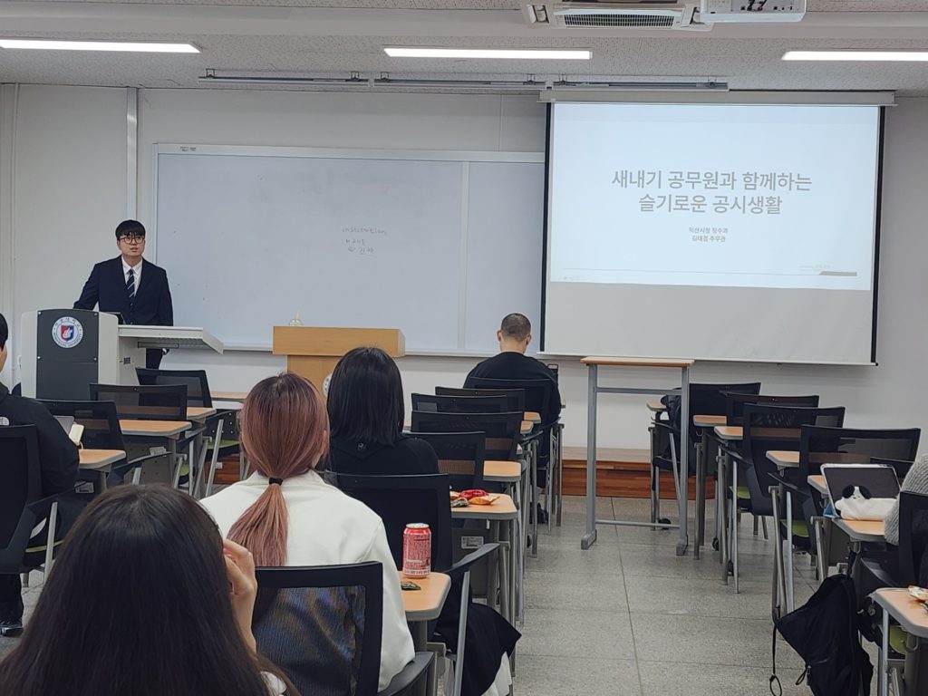 영어교육과 3학년 김태겸 학생이 세무 공무원 시험에 당당히 합격하고 현재 익산시 징수과에서 근무 중인데요! 💼✨ 바쁜 와중에도 후배들을 위해 세무 공무원 진로와 시험 준비 꿀팁을 전수해주는 특별한 시간을 가졌습니다! 🎓 진로 고민부터 실전 팁까지 아낌없이 나눠준 태겸 선배님의 열정 덕분에 후배들의 눈빛도 반짝반짝! 💡 영어교육과의 자랑스러운 선배님, 앞으로의 활약도 응원합니다! 👏💕